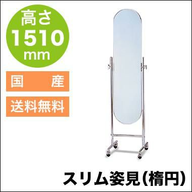 ミラーフレームと脚部パイプはクロームメッキで加工しております。商品名のとおり、鏡面サイズ300mmと当店の姿見の中で最もスリムなデザインです。脚部は丸型パイプを使用しております。