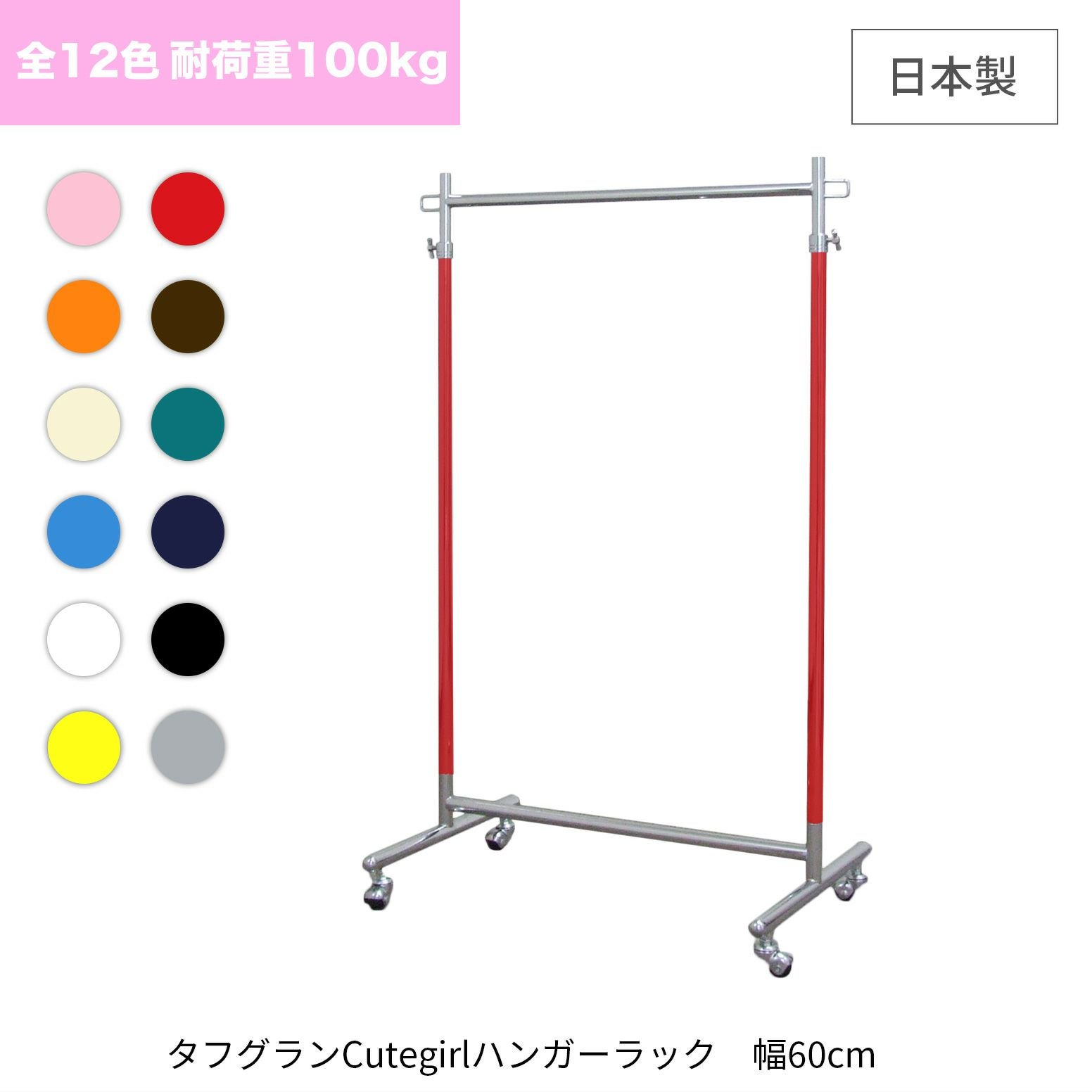 他の画像を見る カラフル!業務用の溶接済み頑丈ハンガーラック 組立不要の完成品! 全12色 幅60cm 耐荷重100kg 最大高さ180cm タフグランCute Girl(キュートガール)ハンガーラック 安全カバー付 当店特別価格 ¥ 29,480 税込 会員特別価格 ¥ 28,980 税込 詳細を見る お気に入りに登録する